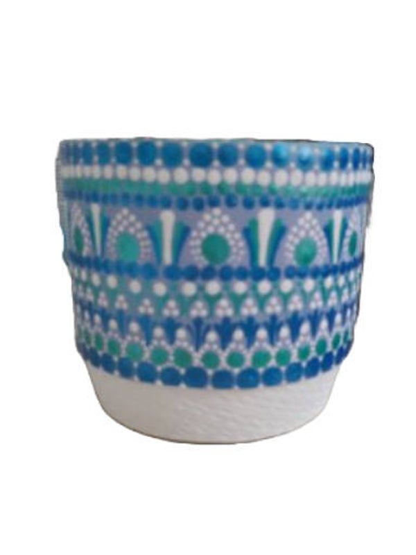 Bring a touch of artistic flair to your space with our plant pot. This ceramic plant pot features a mesmerizing mandala design hand-painted in stunning blue green and white acrylics. It's the perfect addition to your plant collection. Add a pop of color and style to your home or office with this charming plant pot today!