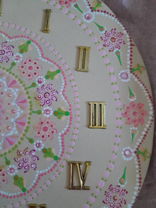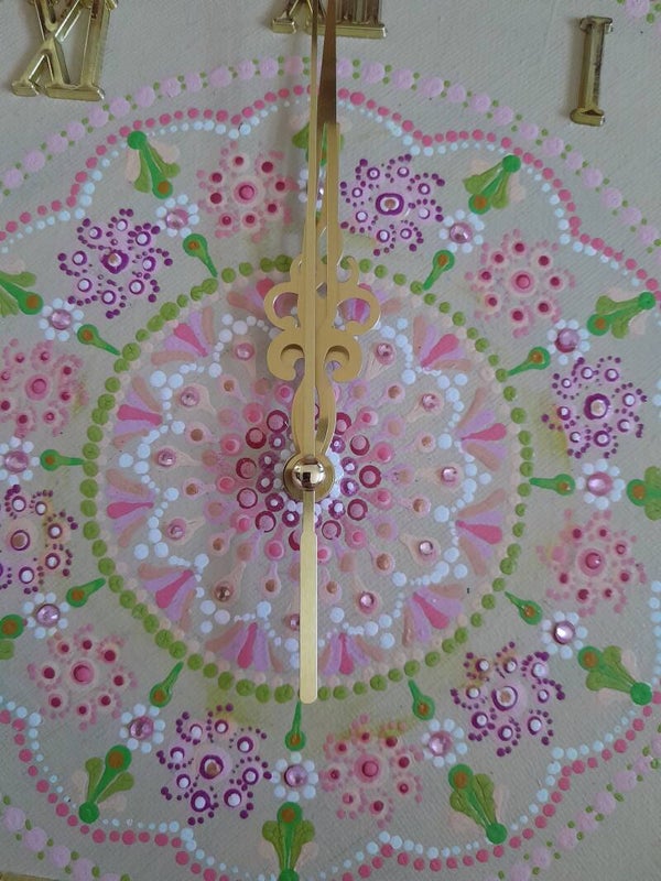 Discover the exquisite blend of artistic flair and functionality with our mandala art clock. Featuring a unique design and intricate craftsmanship, this clock not only tells time but also serves as a stunning decor piece. Elevate your space with this exceptional timepiece today! approx 12 inch diameter painted in acrylics and varnished, with a battery mechanism and gold numerals and hands. Requires one AA battery