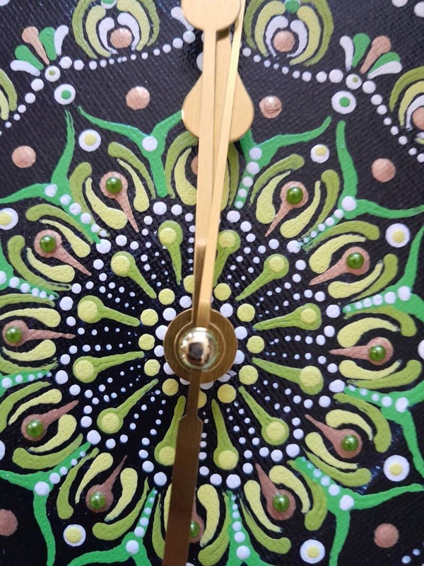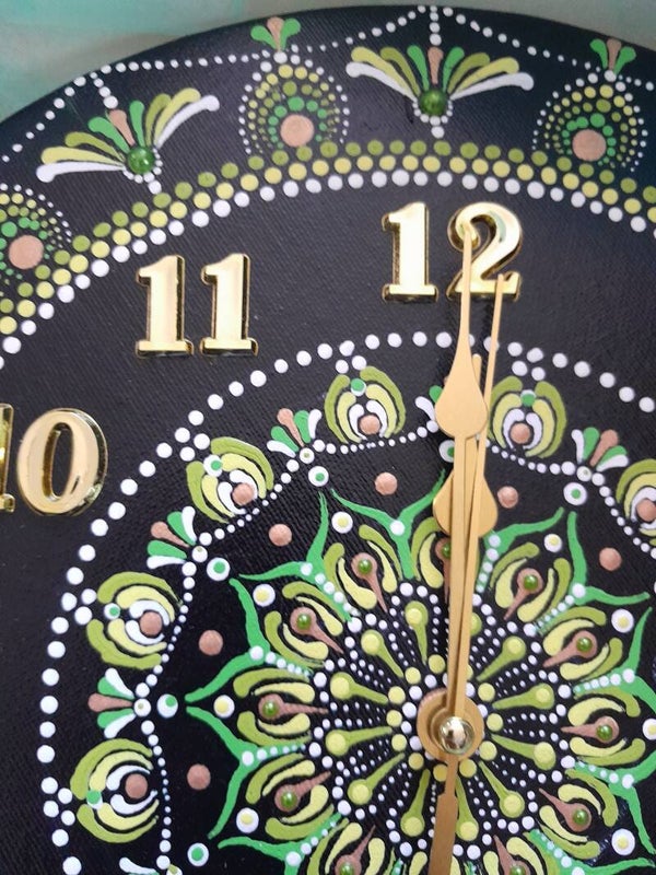 Discover the exquisite blend of artistic flair and functionality with our mandala art clock. Featuring a unique design and intricate craftsmanship, this clock not only tells time but also serves as a stunning decor piece. Elevate your space with this exceptional timepiece today! approx 12 inch diameter painted in acrylics and varnished, with a battery mechanism and gold numerals and hands. Requires one AA battery