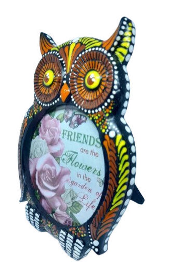 Showcase your cherished memories with this charming owl photo frame, featuring a whimsical design painted in intricate dot art mandala patterns using acrylic paints. Versatile in functionality, it can be displayed on a tabletop or hung on a wall to suit your décor. This unique piece adds a touch of artistic flair to any space while beautifully framing your favorite moments.